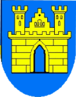 It is a golden (=yellow) gate in a blue field. The gate has an open door and is topped by two towers and a gable.