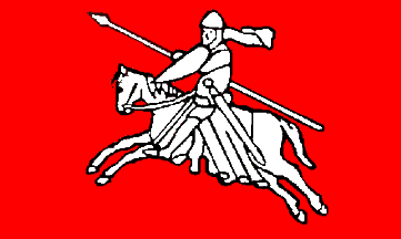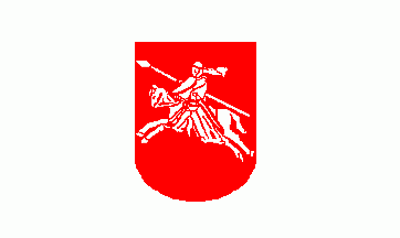 The ratio of flag is 3:5. It is a plain white flag with a red shield, containing a white Satrup knight, in its centre.