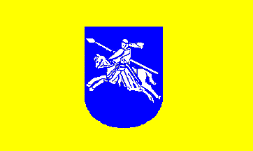 The ratio of flag is 3:5. It is a plain yellow flag with a blue shield, containing a white Satrup knight, in its centre. Yellow and blue had been the colours of the former duchy of Schleswig and the former Flensburg-Land County.