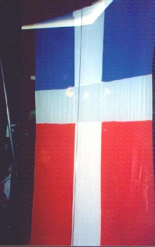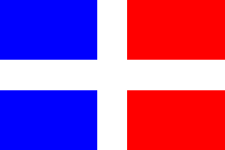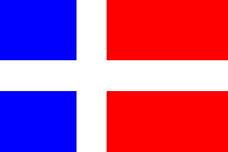According to the above text the flag should be red over blue with a white cross on the whole. I don't think this flag really existed. It might be possible when the flag was in fact a banner, that is a hanging flag, with proportions 2:1 or 3:1. But in that case, blue would be on top and red below.