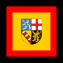 The flag of the Minister-Präsident is a yellow square with a black and red border and the arms in the middle. Flag adopted 10th September 1956.