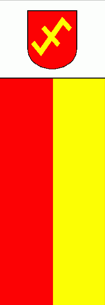It is a red - yellow vertical bicolour with a white bannerhead containing the coat of arms.
