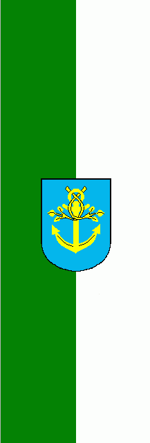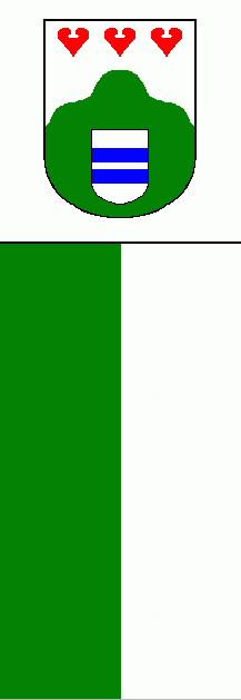 It is a green - white vertical bicolour with a squarish white bannerhead at the top. In its centre is the coat of arms.