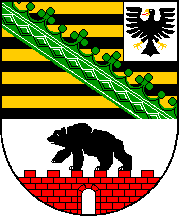 arms show in the upper part the arms of the former Prussian province of Saxony, which are slightly different from the ancient arms of Saxony: in the arms of Saxony, the upper bar is black. The eagle was added to the arms during the Weimar Republic. The lower part shows the arms of the Free State of Anhalt during the Weimar Republic. The bear is taken from the original arms of the Princes of Anhalt, and represent the bear of the estate and city of Bernburg, one of the oldest possessions of the Princes of Anhalt." (Literature: Schurdel 1995.) The bear (Bär) and the wall of a castle (Burg) are canting arms for Bernburg.