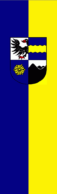 It is a dark blue - yellow vertical bicolour. The coat of arms is shifted to the top.