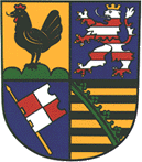 The arms are made up of parts of the arms of the former counties Schmalkalden, Meiningen and Suhl-Land. The rooster, derived from the arms of the counts of Henneberg, was present in all three former arms. The second quarter is the lion of Hessen, and symbolises the fact that the area was owned by the counts of Hessen from 1360-1866. The banner in the third quarter is taken from the arms of Meiningen and indicates the fact that Meiningen was owned by the Prince-Bishops of Würzburg. The arms of Saxony in the fourth quarter are a reminder of the Duchy of Saxony-Meiningen from 1680-1918.Literature: Linder and Olzog 1996.