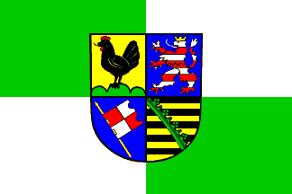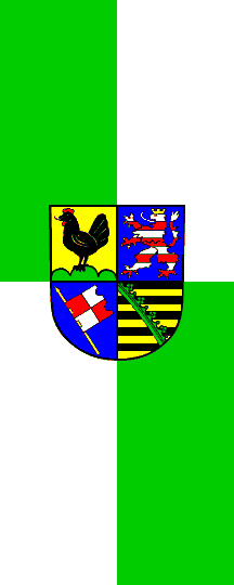 Quartered green-white with the arms. Both a banner [hanging flag] and a [horizontal] flag version exist, the latter has a format of 2:3 (information by Falko Schmidt). The third quarter shows the Rennfähnlein of the diocese of Würzburg (see also the comments on the city flag of Würzburg). Sources: flag from Ulle 2000, arms from the Thuringia official website.