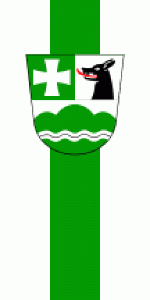 The shield is divided per fess. The upper half is divided per pale into green and silver (= white). Above right is a silver cross patty, above left a black dog's head issuant, tongued red. Below in a silver (= white) field ia a green triple mount, superimposed by a silver (= white) fess wavy.