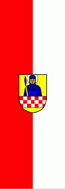 It is a red - white vertical bicolour. The coat of arms is in the centre of the banner.