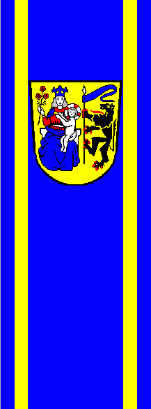 It is a 5-stripes flag divided vertcally into blue - yellow - blue - yellow - blue with ratio 1:1:7:1:1. The coat of arms is in the central stripe and shifted to the top.