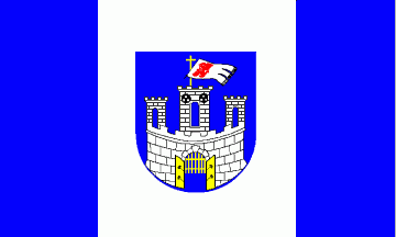 In a blue field is a silver (= white) castle masoned black with three embattled towers. Port and windows are blue. The central tower is bigger and topped by a white gonfanon showing a red griffin. The flagpole is golden (=yellow) with a cross at the top. The port of the castle is open and has a golden ( = yellow) door and a portcullis of the same colour.