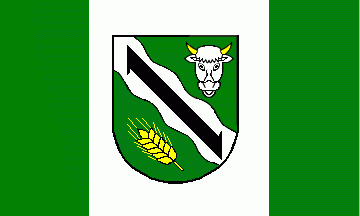 The green shield is divided by a silver (= white), bendy fess superimosed by a black man trap. On the sinister chief point is a silver (= white) bull's head armed golden (= yellow). On the dexter base point is a golden (= yellow) bendy ear of grain (looks like barley).