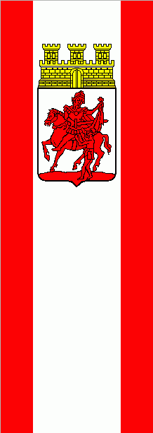 It is a red - white -red vertical triband with ratio 1:3:1. The former coat of arms is shifted to the top.
