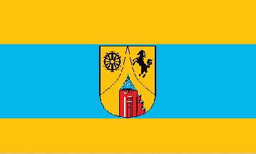 The ratio of flag is 3:5. It is a horizontal yellow over blue over yellow triband. The ratio of stripes is 1:3:1. In the centre of the blue stripe is the coat of arms of the comprehensive municipality.