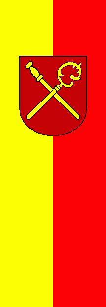 The old, regional border stones displayed two prior's staffs, crossed per saltire. They had been the symbol of the monastery of Backnang. Some of the stones displayed very big pommels at the top. As a result the staffs had been misinterpreted as croziers. Thus around 1900 a seal was created displaying two croziers. In 1931 an old, little flag was found in the town hall. Based on the image upon the flag the current pattern was introduced. The staff of office is alluding to the mundane authority while the crozier reminds on the fact that most parts of the village had been clerical dominions. In 1931 also the colours of the monastery of Backnang, red and yellow, were fixed.