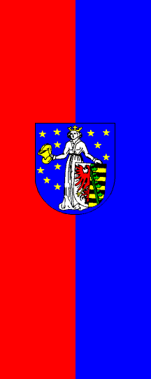 Coswig/Anhalt (not to be confused with Coswig in Saxony near Dresden) has slightly less than 10,000 inhabitants and is in Anhalt-Zerbst county. The flag is blue-red with the arms. Source: Günther 1996a. There is a slight error in the arms, there should be one more star in the lower dexter side (see the correct arms at the city website).