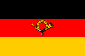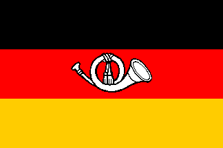 A golden post horn on a black-red-gold tricolor. After 1920, the post horn was frequently white. It was replaced by a very similar flag on 11 April 1921. The two differed only in the width of the red stripe and a small detail in the design of the horn. Source: Dreyer 1999 [dry99].