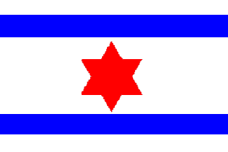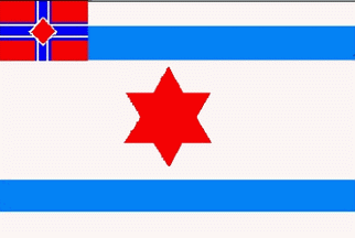 It is a plain white flag divided by two light blue horizontal stripes. In the centre of the flag is a red 6-point star. The canton is a simplified image of the flag of former BRV von 1876, a blue centred cross fimbriated white in a red field with a red diamond also fimbriated white in its centre.