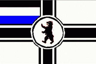 It is a white flag divided by a black cotised cross. In the centre of flag is a white roundel surmounted by a black annulet with a black rampant bear in its centre. The same as in the coat of arms of Berlin. The canton is a black over white over blue horizontal tricolour.