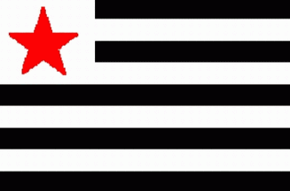 It is a 9-stripes flag with alternating horizontal black and white stripes starting with a black one. In the white canton is a red 5-point star.