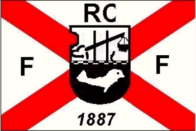 It is a white flag divided by a red saltire. There are black capital letters: "F" (hoist AND fly), "RC" (top) and "1887" (bottom). The whole is in the centre superimposed by a black and white coat of arms divided per fess. The base is showing a white seal or dolphin in a black field. The chief is showing a black arm of a lever, lifting up a black bucket in a white field. Both fields are divided by two thin lines of alternating black and white segments.