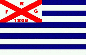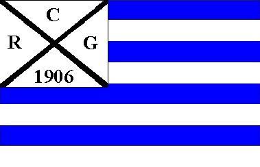 It is a horizontal 8-stripes flag with alternating blue and white stripes starting with a blue one. It has a white canton divided by a black saltire with black capital letters "R" (hoist), "C" (top), "G" (flyend) and