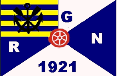 It is a blue (FIAV-code B+) and white flag divided by saltire. There are white capital letters: "R" (hoist) and "N" (fly). There are blue ones as well: "G" (top) and "1921" (bottom). In the centre of the flag is a red ball showing a white wheel with 6 spokes. The canton is a horizontal 7-stripes flag with alternating yellow and blue (FIAV-code B+) stripes starting with a yellow one. The canton is superimposed by a black anchor with two crossed oars.