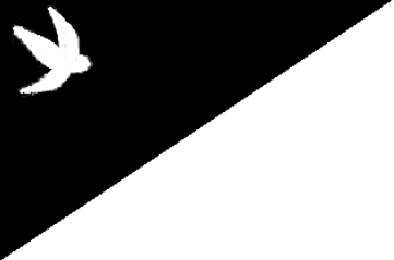 The flag is divided per bend sinister. It is white at the flyend and black at the hoist. In the canton is a white swallow.