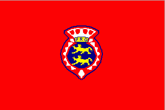 It is a plain red flag with the club's logo in ist centre. The logo is a modified coat of arms of the duchy of Schleswig, with inverted colours. A blue inscription "FRG" is added onto the yellow base of the coronet.