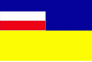 It is a blue over yellow horizontal bicolour. Blue and yellow had been the colours of former duchy of Schleswig. The canton is the flag of Schleswig-Holstein, a red over white over blue horizontal tricolour.