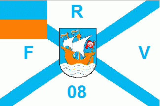 The white flag is divided by a celestial blue saltire with inscriptions of the same colour upon every quarter as follows: "F" (hoist), "R" (top), "V" (fly) and "08" (bottom). The canton is a celestial blue over orange horizontal bicolour. The centre of the saltire is superimposed by a modified version of the coat of arms of Flörsheim with the ship having an orange bottom and a celestial blue background.
