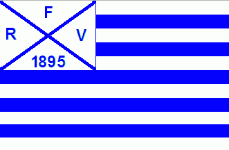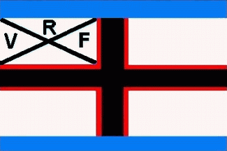 The white flag is divided by a centred black cross fimbriated red. Blue stripes are on the top- and bottom edges of the flag. The upper hoist quarter is divided by a black saltire with black capitals in three of its quarters:"R"(top), "V"(hoist) and "F"(fly)
