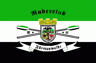 It is a horizontal green over white over black tricolour. In the centre of the white stripe is the coat of arms of the city, topped by a yellow mural crown and superimposing a pair of crossed oars having the club's blade pattern ( a horizontal tricolour like described above). In the green stripe is an embowed inscription "Ruderclub", in the black stripe "Fürstenwalde" placed onto a white ribbon.