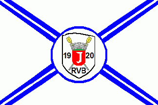 A red asymmetric shield containing a white tool shaped like a "J" (probably part of a plough) is superimposing a yellow greyish pair of crossed oars. The shield is flanked by black inscriptions "19"(left), "20"(right) and "RVB"(bottom).