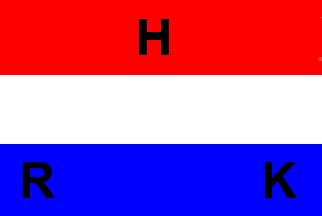 It is a red over white over blue tricolour. In the centre of the red stripe is a black capital "H", in the blue there are black capital letters "R" (hoist) and "K" (fly).