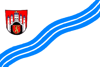 It is a white flag divided by a light.blue sinister-bendy wavy line, which is itself divided by two narrow white wavy lines. In the upper hoist is the coat of arms of the city.