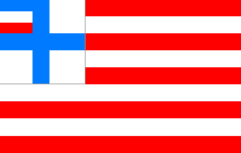It is a horizontal 9-stripes flag with alternating red and white stripes, starting with a red one. The flag has a square white canton divided by a blue centred cross. In the canton's upper hoist quarter is a blue over white over red horizontal tricolour.