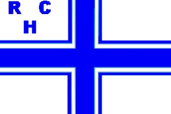 It is a white flag divided by a blue cotized centred cross and blue capital letters in the canton in a triangular formation: "RC" upper row, "H" lower row.