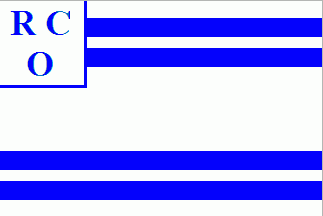 It is a white flag divided by two pairs of dark blue horizontal lines. The white squarish canton is separarted by thin dark blue lines containing a dark blue inscription "RC" over "O".