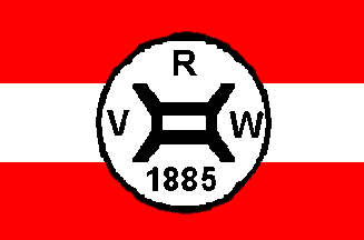It is a red over white horizontal bicolour, in the centre is a shield having a black chief with a dotted white inscription "R.V.E.". A white horse is standing before a black tree. The horse is taken from the coat of arms of Wanne-Eickel.