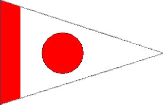 It is a white triangular pennant with a red roundel in its centre and a vertical red stripe at the hoist.