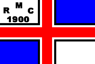 The flag is divided by a red centred cross with white and black fimbriation. The lower hoist and the upper fly are blue, the other quarters are white. In the upper hoist is a black inscription "M" over "RC" over "1900".