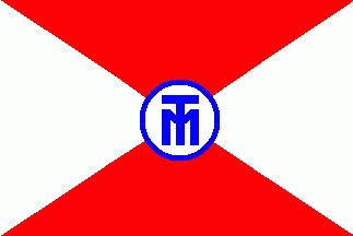 The flag is divided per saltire into white (hoist and fly) and red (top and bottom). In the centre is a blue capital "M" superimposing a "T" in a white disc fimbriated blue.