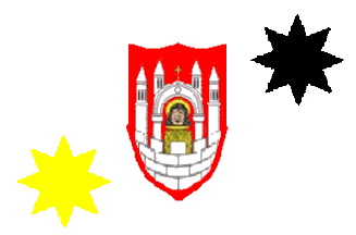 It is a white flag with the coat of arms of the city of Merseburg in its centre. In the lower hoist is a yellow 8-point star, in the upper fly a black one.