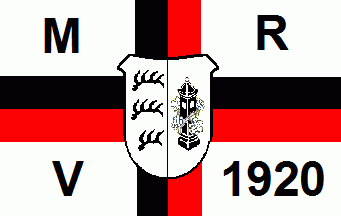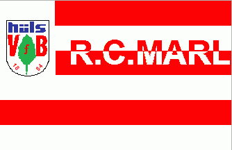 It is a 6-stripes flag divided horizontally by red and white lines starting with a red one. In the canton is the logo of the club showing a blue lower case inscription hüls in the chief, a green leaf superimposed by a red "f" and flanked by red "V" and "B". In the base is an embowed red "1884"(!). The inscription. "R.C.Marl" is countercharged and superimposing the 2nd and 3rd stripe.