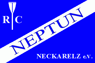 The blue flag is divided per bend sinister by a white stripe containing a blue inscription "NEPTUN". In the upper hoist corner is an upright white oar flanked by white capitals "R" and "C". In the lower fly corner is a white inscription "NECKARELZ e.V."