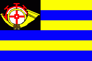 It is a 6-stripes flag divided by alternating yellow and blue stripes starting with a yellow one. The flag has a black canton in which a yellowish horn is superimposing a red mill wheel placed on a white background. This image is connecting the horn as a symbol of German mail with the wheel taken from the local coat of arms.