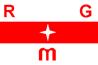 It is a white over red over white flag. In the centre of the red stripe is a white 4-point star. In the centre of the lower white stripe is a red lower case "m", at both sides of the upper white stripe are red capital letters "R" and "G".