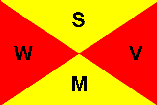 The flag is divided per saltire into yellow(top and bottom) and red(hoist and fly). There are black capital letters "W"(hoist), "S"(top), "V"(fly) and "M"(bottom).