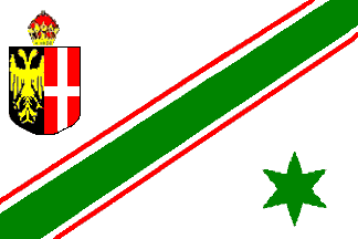 It is a white flag, divided by a red cotized sinister-bendy green line. In the upper hoist is an image of a part of the cities coat of arms (without balls) and in the lower fly is a green 6-point star.